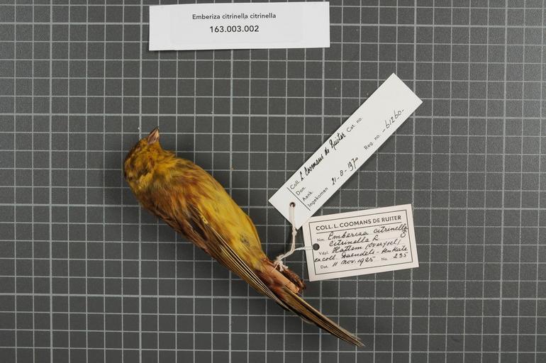 | Keywords: Naturalis Biodiversity Center - RMNH.AVES.61260 1 1 - Emberiza citrinella citrinella Linnaeus, 1758 - Emberizidae - bird skin specimen.jpeg artwork Dimensions artwork Document type Emberizidae Emberiza Individual count 1 Infraspecific epithet citrinella Infraspecific rank Institution Naturalis Kind of unit artwork Kind of unit specimen skin Life stage Overijsel Hattem Medium artwork Nomenclatural code ADDITIONAL preparation info praep W Engels Zwolle Occurrence ID page Other fields Other versions artwork Permission license Naturalis donation CC-0 Publication location Scientific name Emberiza citrinella citrinella Linnaeus 1758 Scientific name authorship Linnaeus 1758 male Source url http //bioportal naturalis nl Specific epithet citrinella State or province Overijsel Subject keywords artwork Subject keywords publication Title artwork Title publication Type status Uploaded with GWToolset Naturalis_Biodiversity_Center_-_RMNH AVES 61260_1_1_-_Emberiza_citrinella_citrinella_Linnaeus _1758_-_Emberizidae_-_bird_skin_specimen http //medialib naturalis nl/file/id/RMNH AVES 61260_1_1/format/large Media donated by Naturalis Biodiversity Center Songbird specimens at Naturalis Biodiversity Center Emberiza citrinella Emberiza |