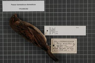 | Keywords: Naturalis Biodiversity Center - RMNH.AVES.61380 1 - Passer domesticus domesticus (Linnaeus, 1758) - Ploceidae - bird skin specimen.jpeg artwork Dimensions artwork Document type Ploceidae Passer Individual count 1 Infraspecific epithet domesticus Infraspecific rank Institution Naturalis Kind of unit artwork Kind of unit specimen skin Life stage Netherlands Overijssel Hattem Medium artwork Nomenclatural code Region remark On Coomans label overysel Occurrence ID page Other fields Other versions artwork Permission license Naturalis donation CC-0 Publication location Scientific name Passer domesticus domesticus Linnaeus 1758 Scientific name authorship Linnaeus 1758 male Source url http //bioportal naturalis nl Specific epithet domesticus State or province Overijssel Subject keywords artwork Subject keywords publication Title artwork Title publication Type status Uploaded with GWToolset Naturalis_Biodiversity_Center_-_RMNH AVES 61380_1_-_Passer_domesticus_domesticus_ Linnaeus _1758 _-_Ploceidae_-_bird_skin_specimen http //medialib naturalis nl/file/id/RMNH AVES 61380_1/format/large Media donated by Naturalis Biodiversity Center Songbird specimens at Naturalis Biodiversity Center Passer domesticus Passer |