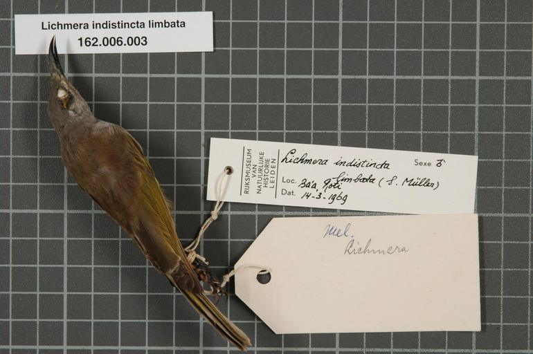 | Keywords: Naturalis Biodiversity Center - RMNH.AVES.65542 1 - Lichmera indistincta limbata (S. Muller, 1843) - Meliphagidae - bird skin specimen.jpeg  artwork Dimensions artwork Document type Meliphagidae Lichmera Individual count 1 Infraspecific epithet limbata Infraspecific rank Institution Naturalis Kind of unit artwork Kind of unit specimen skin Life stage Roti Ba'a Medium artwork Nomenclatural code Occurrence ID page Other fields Other versions artwork Permission license Naturalis donation CC-0 Publication location Scientific name Lichmera indistincta limbata S Muller 1843 Scientific name authorship S Müller 1843 male Source url http //bioportal naturalis nl Specific epithet indistincta State or province Roti Subject keywords artwork Subject keywords publication Title artwork Title publication Type status Uploaded with GWToolset Naturalis_Biodiversity_Center_-_RMNH AVES 65542_1_-_Lichmera_indistincta_limbata_ S _Muller _1843 _-_Meliphagidae_-_bird_skin_specimen http //medialib naturalis nl/file/id/RMNH AVES 65542_1/format/large Media donated by Naturalis Biodiversity Center Songbird specimens at Naturalis Biodiversity Center Lichmera indistincta Lichmera |
