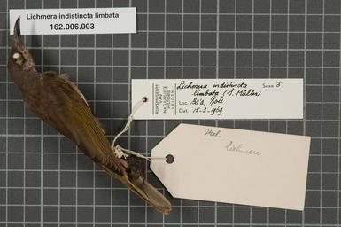 | Keywords: Naturalis Biodiversity Center - RMNH.AVES.65543 1 - Lichmera indistincta limbata (S. Muller, 1843) - Meliphagidae - bird skin specimen.jpeg  artwork Dimensions artwork Document type Meliphagidae Lichmera Individual count 1 Infraspecific epithet limbata Infraspecific rank Institution Naturalis Kind of unit artwork Kind of unit specimen skin Life stage Roti Ba'a Medium artwork Nomenclatural code Occurrence ID page Other fields Other versions artwork Permission license Naturalis donation CC-0 Publication location Scientific name Lichmera indistincta limbata S Muller 1843 Scientific name authorship S Müller 1843 male Source url http //bioportal naturalis nl Specific epithet indistincta State or province Roti Subject keywords artwork Subject keywords publication Title artwork Title publication Type status Uploaded with GWToolset Naturalis_Biodiversity_Center_-_RMNH AVES 65543_1_-_Lichmera_indistincta_limbata_ S _Muller _1843 _-_Meliphagidae_-_bird_skin_specimen http //medialib naturalis nl/file/id/RMNH AVES 65543_1/format/large Media donated by Naturalis Biodiversity Center Songbird specimens at Naturalis Biodiversity Center Lichmera indistincta Lichmera |