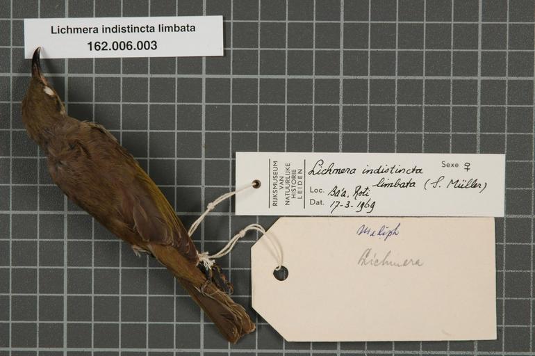 | Keywords: Naturalis Biodiversity Center - RMNH.AVES.65544 1 - Lichmera indistincta limbata (S. Muller, 1843) - Meliphagidae - bird skin specimen.jpeg  artwork Dimensions artwork Document type Meliphagidae Lichmera Individual count 1 Infraspecific epithet limbata Infraspecific rank Institution Naturalis Kind of unit artwork Kind of unit specimen skin Life stage Roti Ba'a Medium artwork Nomenclatural code Occurrence ID page Other fields Other versions artwork Permission license Naturalis donation CC-0 Publication location Scientific name Lichmera indistincta limbata S Muller 1843 Scientific name authorship S Müller 1843 female Source url http //bioportal naturalis nl Specific epithet indistincta State or province Roti Subject keywords artwork Subject keywords publication Title artwork Title publication Type status Uploaded with GWToolset Naturalis_Biodiversity_Center_-_RMNH AVES 65544_1_-_Lichmera_indistincta_limbata_ S _Muller _1843 _-_Meliphagidae_-_bird_skin_specimen http //medialib naturalis nl/file/id/RMNH AVES 65544_1/format/large Media donated by Naturalis Biodiversity Center Songbird specimens at Naturalis Biodiversity Center Lichmera indistincta Lichmera |