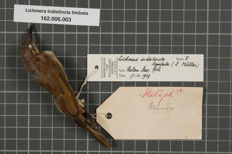 | Keywords: Naturalis Biodiversity Center - RMNH.AVES.65552 1 - Lichmera indistincta limbata (S. Muller, 1843) - Meliphagidae - bird skin specimen.jpeg  artwork Dimensions artwork Document type Meliphagidae Lichmera Individual count 1 Infraspecific epithet limbata Infraspecific rank Institution Naturalis Kind of unit artwork Kind of unit specimen skin Life stage Roti Pulau Dao Medium artwork Nomenclatural code Occurrence ID page Other fields Other versions artwork Permission license Naturalis donation CC-0 Publication location Scientific name Lichmera indistincta limbata S Muller 1843 Scientific name authorship S Müller 1843 male Source url http //bioportal naturalis nl Specific epithet indistincta State or province Roti Subject keywords artwork Subject keywords publication Title artwork Title publication Type status Uploaded with GWToolset Naturalis_Biodiversity_Center_-_RMNH AVES 65552_1_-_Lichmera_indistincta_limbata_ S _Muller _1843 _-_Meliphagidae_-_bird_skin_specimen http //medialib naturalis nl/file/id/RMNH AVES 65552_1/format/large Media donated by Naturalis Biodiversity Center Songbird specimens at Naturalis Biodiversity Center Lichmera indistincta Lichmera |