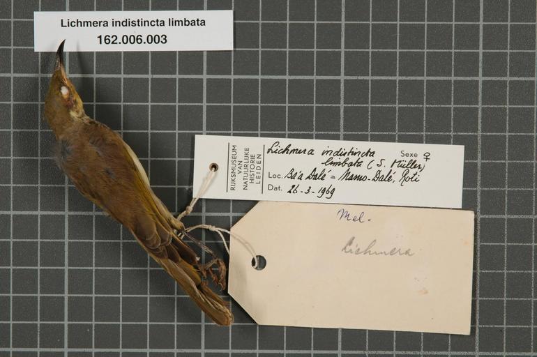 Keywords: Naturalis Biodiversity Center - RMNH.AVES.65556 1 - Lichmera indistincta limbata (S. Muller, 1843) - Meliphagidae - bird skin specimen.jpeg artwork Dimensions artwork Document type Meliphagidae Lichmera Individual count 1 Infraspecific epithet limbata Infraspecific rank Institution Naturalis Kind of unit artwork Kind of unit specimen skin Life stage Roti Ba'a Dalé Namo-Dalé Medium artwork Nomenclatural code Occurrence ID page Other fields Other versions artwork Permission license Naturalis donation CC-0 Publication location Scientific name Lichmera indistincta limbata S Muller 1843 Scientific name authorship S Müller 1843 female Source url http //bioportal naturalis nl Specific epithet indistincta State or province Roti Subject keywords artwork Subject keywords publication Title artwork Title publication Type status Uploaded with GWToolset Naturalis_Biodiversity_Center_-_RMNH AVES 65556_1_-_Lichmera_indistincta_limbata_ S _Muller _1843 _-_Meliphagidae_-_bird_skin_specimen http //medialib naturalis nl/file/id/RMNH AVES 65556_1/format/large Media donated by Naturalis Biodiversity Center Songbird specimens at Naturalis Biodiversity Center Lichmera indistincta Lichmera