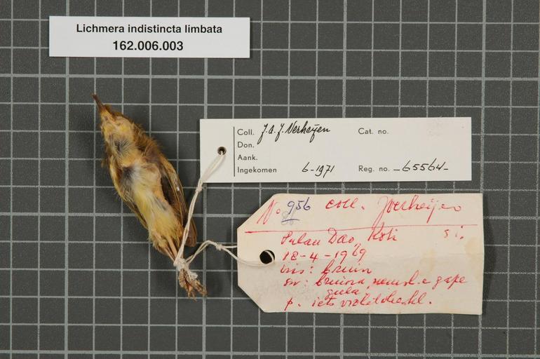 | Keywords: Naturalis Biodiversity Center - RMNH.AVES.65564 2 - Lichmera indistincta limbata (S. Muller, 1843) - Meliphagidae - bird skin specimen.jpeg  artwork Dimensions artwork Document type Meliphagidae Lichmera Individual count 1 Infraspecific epithet limbata Infraspecific rank Institution Naturalis Kind of unit artwork Kind of unit specimen skin Life stage juvenile Roti Pulau Dao Medium artwork Nomenclatural code Sex remark On RMNH label -On original label s i Occurrence ID page Other fields Other versions artwork Permission license Naturalis donation CC-0 Publication location Scientific name Lichmera indistincta limbata S Muller 1843 Scientific name authorship S Müller 1843 Source url http //bioportal naturalis nl Specific epithet indistincta State or province Roti Subject keywords artwork Subject keywords publication Title artwork Title publication Type status Uploaded with GWToolset Naturalis_Biodiversity_Center_-_RMNH AVES 65564_2_-_Lichmera_indistincta_limbata_ S _Muller _1843 _-_Meliphagidae_-_bird_skin_specimen http //medialib naturalis nl/file/id/RMNH AVES 65564_2/format/large Media donated by Naturalis Biodiversity Center Songbird specimens at Naturalis Biodiversity Center Lichmera indistincta Lichmera |