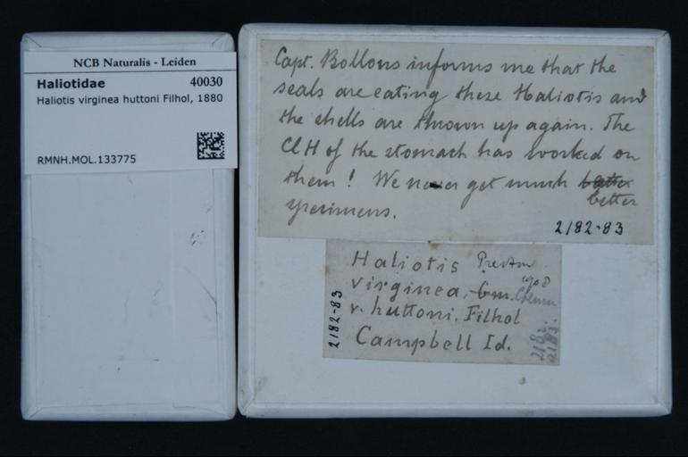 | Keywords: Naturalis Biodiversity Center - RMNH.MOL.133775 1 - Haliotis virginea huttoni Filhol, 1880 - Haliotidae - Mollusc shell.jpeg artwork Dimensions artwork Document type Haliotidae Haliotis Individual count Infraspecific epithet Infraspecific rank Institution Naturalis Kind of unit artwork Kind of unit specimen shell Life stage Medium artwork Nomenclatural code Source institute Leiden Scale the width of the text on the species/QR-code label is 38 mm Occurrence ID page Other fields Other versions artwork Permission license Naturalis donation CC-0 Mollusca Publication location Scientific name Haliotis virginea huttoni Filhol 1880 Scientific name authorship Filhol 1880 Source url http //bioportal naturalis nl Specific epithet virginea huttoni State or province Subject keywords artwork Subject keywords publication Title artwork Title publication Type status Uploaded with GWToolset Naturalis_Biodiversity_Center_-_RMNH MOL 133775_1_-_Haliotis_virginea_huttoni_Filhol _1880_-_Haliotidae_-_Mollusc_shell http //medialib naturalis nl/file/id/RMNH MOL 133775_1/format/large Molluscs at Naturalis from the Rijksmuseum van Natuurlijke Historie Media donated by Naturalis Biodiversity Center Haliotis Haliotis virginea huttoni |