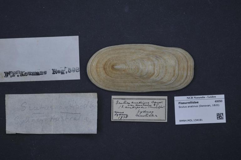 | Keywords: Naturalis Biodiversity Center - RMNH.MOL.134181 - Scutus anatinus (Donovan, 1820) - Fissurellidae - Mollusc shell.jpeg artwork Dimensions artwork Document type Fissurellidae subfamily Emarginulinae Scutus Individual count Infraspecific epithet Infraspecific rank Institution Naturalis Kind of unit artwork Kind of unit specimen shell Life stage Medium artwork Nomenclatural code Source institute Leiden Scale the width of the text on the species/QR-code label is 38 mm Occurrence ID page Other fields Other versions artwork Permission license Naturalis donation CC-0 Mollusca Publication location Scientific name Scutus anatinus Donovan 1820 Scientific name authorship Donovan 1820 Source url http //bioportal naturalis nl Specific epithet anatinus State or province Subject keywords artwork Subject keywords publication Title artwork Title publication Type status Uploaded with GWToolset Naturalis_Biodiversity_Center_-_RMNH MOL 134181_-_Scutus_anatinus_ Donovan _1820 _-_Fissurellidae_-_Mollusc_shell http //medialib naturalis nl/file/id/RMNH MOL 134181/format/large Molluscs at Naturalis from the Rijksmuseum van Natuurlijke Historie Media donated by Naturalis Biodiversity Center Scutus Scutus anatinus |