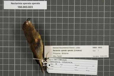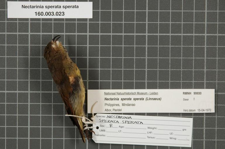 | Keywords: Naturalis Biodiversity Center - RMNH.AVES.99930 1 - Nectarinia sperata sperata (Linnaeus, 1766) - Nectariniidae - bird skin specimen.jpeg artwork Dimensions artwork Document type Nectariniidae Nectarinia Individual count 1 Infraspecific epithet sperata Infraspecific rank Institution Naturalis Kind of unit artwork Kind of unit specimen skin Life stage Philippines Mindanao Id Surigao del Norte Plaridel Albor Medium artwork Nomenclatural code Occurrence ID page Other fields Other versions artwork Permission license Naturalis donation CC-0 Publication location Scientific name Nectarinia sperata sperata Linnaeus 1766 Scientific name authorship Linnaeus 1766 female Source url http //bioportal naturalis nl Specific epithet sperata State or province Subject keywords artwork Subject keywords publication Title artwork Title publication Type status Uploaded with GWToolset Naturalis_Biodiversity_Center_-_RMNH AVES 99930_1_-_Nectarinia_sperata_sperata_ Linnaeus _1766 _-_Nectariniidae_-_bird_skin_specimen http //medialib naturalis nl/file/id/RMNH AVES 99930_1/format/large Media donated by Naturalis Biodiversity Center Songbird specimens at Naturalis Biodiversity Center Leptocoma sperata |