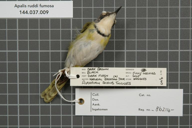 | Keywords: Naturalis Biodiversity Center - RMNH.AVES.86214 2 - Apalis ruddi fumosa Clancey, 1966 - Sylviidae - bird skin specimen.jpeg artwork Dimensions artwork Document type Sylviidae Apalis Individual count 1 Infraspecific epithet fumosa Infraspecific rank Institution Naturalis Kind of unit artwork Kind of unit specimen skin Life stage adult South Africa S Eastern Transvaal Pongola River Kuneningi 10 miles east Pongola Medium artwork Nomenclatural code ADDITIONAL FAMILY INFO natural breeding pair Occurrence ID page Other fields Other versions artwork Permission license Naturalis donation CC-0 Publication location Scientific name Apalis ruddi fumosa Clancey 1966 Scientific name authorship Clancey 1966 female Source url http //bioportal naturalis nl Specific epithet ruddi State or province S Eastern Transvaal Subject keywords artwork Subject keywords publication Title artwork Title publication Type status Uploaded with GWToolset Naturalis_Biodiversity_Center_-_RMNH AVES 86214_2_-_Apalis_ruddi_fumosa_Clancey _1966_-_Sylviidae_-_bird_skin_specimen http //medialib naturalis nl/file/id/RMNH AVES 86214_2/format/large Media donated by Naturalis Biodiversity Center Songbird specimens at Naturalis Biodiversity Center Apalis ruddi |