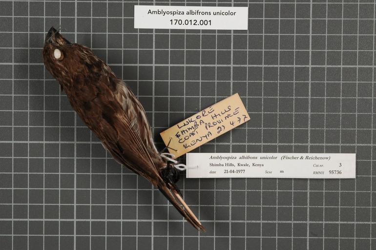 Keywords: Naturalis Biodiversity Center - RMNH.AVES.95736 1 - Amblyospiza albifrons unicolor (Fischer and Reichenow, 1878) - Ploceidae - bird skin specimen.jpeg artwork Dimensions artwork Document type Ploceidae Amblyospiza Individual count 1 Infraspecific epithet unicolor Infraspecific rank Institution Naturalis Kind of unit artwork Kind of unit specimen skin Life stage Kenya Coast Province Kwale Shimba Hills Lukore Medium artwork Nomenclatural code Occurrence ID page Other fields Other versions artwork Permission license Naturalis donation CC-0 Publication location Scientific name Amblyospiza albifrons unicolor Fischer and Reichenow 1878 Scientific name authorship Fischer and Reichenow 1878 male Source url http //bioportal naturalis nl Specific epithet albifrons State or province Coast Province Kwale Shimba Hills Subject keywords artwork Subject keywords publication Title artwork Title publication Type status Uploaded with GWToolset Naturalis_Biodiversity_Center_-_RMNH AVES 95736_1_-_Amblyospiza_albifrons_unicolor_ Fischer_and_Reichenow _1878 _-_Ploceidae_-_bird_skin_specimen http //medialib naturalis nl/file/id/RMNH AVES 95736_1/format/large Media donated by Naturalis Biodiversity Center Songbird specimens at Naturalis Biodiversity Center Amblyospiza albifrons museum specimens |