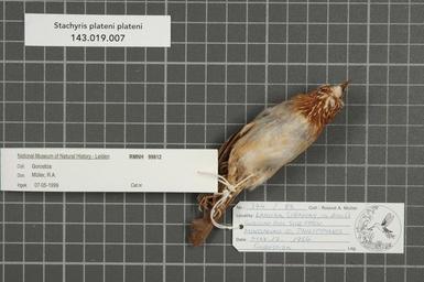 | Keywords: Naturalis Biodiversity Center - RMNH.AVES.99812 2 - Stachyris plateni plateni (Blasius, 1890) - Timaliidae - bird skin specimen.jpeg artwork Dimensions artwork Document type Timaliidae Stachyris Individual count 1 Infraspecific epithet plateni Infraspecific rank Institution Naturalis Kind of unit artwork Kind of unit specimen skin Life stage adult Philippines Mindanao Id Surigao del Sur Prov Sibahay Lanuza Medium artwork Nomenclatural code Occurrence ID page Other fields Other versions artwork Permission license Naturalis donation CC-0 Publication location Scientific name Stachyris plateni plateni Blasius 1890 Scientific name authorship Blasius 1890 male Source url http //bioportal naturalis nl Specific epithet plateni State or province Subject keywords artwork Subject keywords publication Title artwork Title publication Type status Uploaded with GWToolset Naturalis_Biodiversity_Center_-_RMNH AVES 99812_2_-_Stachyris_plateni_plateni_ Blasius _1890 _-_Timaliidae_-_bird_skin_specimen http //medialib naturalis nl/file/id/RMNH AVES 99812_2/format/large Media donated by Naturalis Biodiversity Center Songbird specimens at Naturalis Biodiversity Center Dasycrotapha plateni |