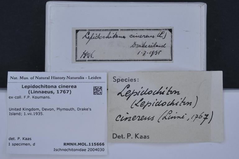 | Keywords: Naturalis Biodiversity Center - RMNH.MOL.115666 1 - Lepidochitona cinerea (Linnaeus, 1767) - Ischnochitonidae - Mollusc shell.jpeg artwork Dimensions artwork Document type Ischnochitonidae subfamily Lepidochitoninae Lepidochitona Kaas P Individual count Infraspecific epithet Infraspecific rank Institution Naturalis Kind of unit artwork Kind of unit specimen shell Life stage United Kingdom Devon Plymouth Drake's Island; 1 vii 1935 Medium artwork Nomenclatural code Source institute Leiden Scale the width of the text on the species/QR-code label is 38 mm Occurrence ID page Other fields Other versions artwork Permission license Naturalis donation CC-0 Mollusca Publication location Scientific name Lepidochitona cinerea Linnaeus 1767 Scientific name authorship Linnaeus 1767 Source url http //bioportal naturalis nl Specific epithet cinerea State or province Devon Subject keywords artwork Subject keywords publication Title artwork Title publication Type status - Uploaded with GWToolset Naturalis_Biodiversity_Center_-_RMNH MOL 115666_1_-_Lepidochitona_cinerea_ Linnaeus _1767 _-_Ischnochitonidae_-_Mollusc_shell http //medialib naturalis nl/file/id/RMNH MOL 115666_1/format/large Molluscs at Naturalis from the Rijksmuseum van Natuurlijke Historie Media donated by Naturalis Biodiversity Center Lepidochitona Lepidochitona cinerea |