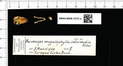 | Keywords: Naturalis Biodiversity Center - RMNH.MAM.14737.a pal - Mormoops megalophylla intermedia - skull.jpeg artwork Dimensions artwork Document type Mormoops Individual count 1 Infraspecific epithet intermedia Infraspecific rank Institution Naturalis Kind of unit artwork Kind of unit specimen skull Life stage Curaçao Cueba Bosá Medium artwork Nomenclatural code Occurrence ID page Other fields Other versions artwork Permission license Naturalis donation CC-0 Publication location Scientific name Mormoops megalophylla intermedia Scientific name authorship male Source url http //bioportal naturalis nl Specific epithet megalophylla State or province Subject keywords artwork Subject keywords publication Title artwork Title publication Type status Uploaded with GWToolset Naturalis_Biodiversity_Center_-_RMNH MAM 14737 a_pal_-_Mormoops_megalophylla_intermedia_-_skull http //medialib naturalis nl/file/id/RMNH MAM 14737 a_pal/format/large Media donated by Naturalis Biodiversity Center Mammals at Naturalis from the Rijksmuseum van Natuurlijke Historie Mormoops megalophylla Mormoops |