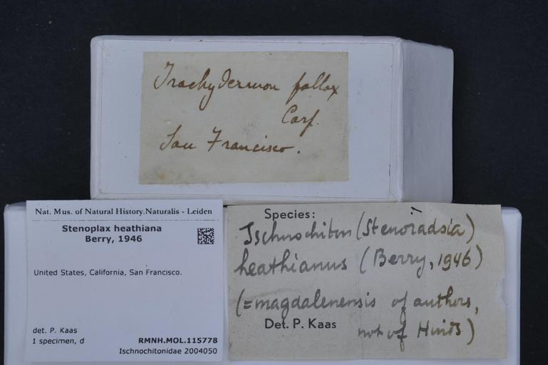 | Keywords: Naturalis Biodiversity Center - RMNH.MOL.115778 1 - Stenoplax heathiana Berry, 1946 - Ischnochitonidae - Mollusc shell.jpeg artwork Dimensions artwork Document type Ischnochitonidae subfamily Ischnochitoninae Stenoplax Kaas P Individual count Infraspecific epithet Infraspecific rank Institution Naturalis Kind of unit artwork Kind of unit specimen shell Life stage United States California San Francisco Medium artwork Nomenclatural code Source institute Leiden Scale the width of the text on the species/QR-code label is 38 mm Occurrence ID page Other fields Other versions artwork Permission license Naturalis donation CC-0 Mollusca Publication location Scientific name Stenoplax heathiana Berry 1946 Scientific name authorship Berry 1946 Source url http //bioportal naturalis nl Specific epithet heathiana State or province California Subject keywords artwork Subject keywords publication Title artwork Title publication Type status - Uploaded with GWToolset Naturalis_Biodiversity_Center_-_RMNH MOL 115778_1_-_Stenoplax_heathiana_Berry _1946_-_Ischnochitonidae_-_Mollusc_shell http //medialib naturalis nl/file/id/RMNH MOL 115778_1/format/large Molluscs at Naturalis from the Rijksmuseum van Natuurlijke Historie Media donated by Naturalis Biodiversity Center Stenoplax Stenoplax heathiana |