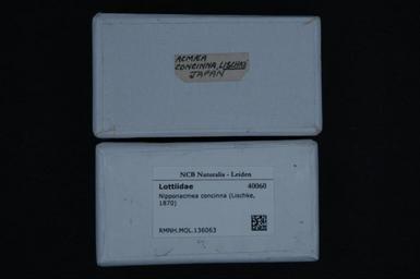 Keywords: Naturalis Biodiversity Center - RMNH.MOL.136063 1 - Nipponacmea concinna (Lischke, 1870) - Lottiidae - Mollusc shell.jpeg artwork Dimensions artwork Document type Lottiidae Nipponacmea Individual count Infraspecific epithet Infraspecific rank Institution Naturalis Kind of unit artwork Kind of unit specimen shell Life stage Medium artwork Nomenclatural code Source institute Leiden Scale the width of the text on the species/QR-code label is 38 mm Occurrence ID page Other fields Other versions artwork Permission license Naturalis donation CC-0 Mollusca Publication location Scientific name Nipponacmea concinna Lischke 1870 Scientific name authorship Lischke 1870 Source url http //bioportal naturalis nl Specific epithet concinna State or province Subject keywords artwork Subject keywords publication Title artwork Title publication Type status Uploaded with GWToolset Naturalis_Biodiversity_Center_-_RMNH MOL 136063_1_-_Nipponacmea_concinna_ Lischke _1870 _-_Lottiidae_-_Mollusc_shell http //medialib naturalis nl/file/id/RMNH MOL 136063_1/format/large Molluscs at Naturalis from the Rijksmuseum van Natuurlijke Historie Media donated by Naturalis Biodiversity Center Nipponacmea Nipponacmea concinna |