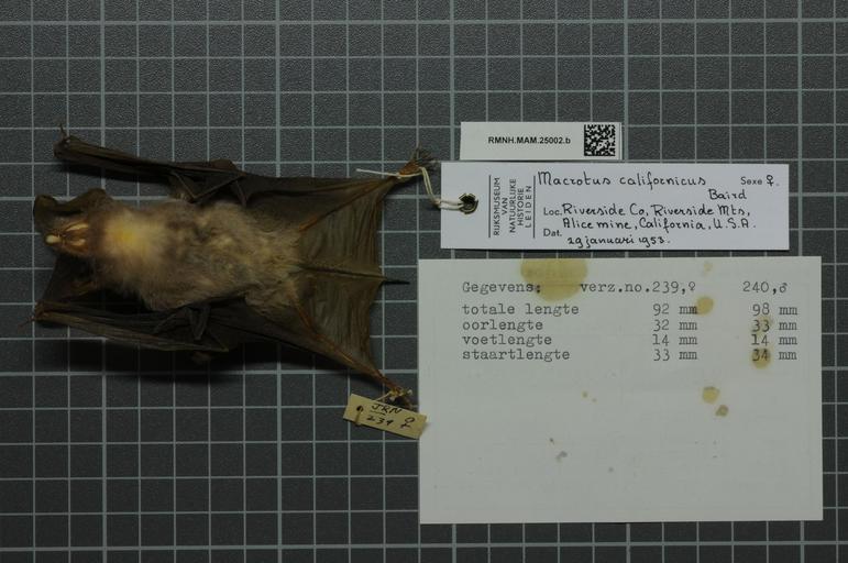 | Keywords: Naturalis Biodiversity Center - RMNH.MAM.25002.b ven - Macrotus californicus - skin.jpeg artwork Dimensions artwork Document type Macrotus Individual count 1 Infraspecific epithet Infraspecific rank Institution Naturalis Kind of unit artwork Kind of unit specimen skin Life stage Riverside Co Riverside Mts Alice mine California U S A Medium artwork Nomenclatural code Occurrence ID page Other fields Other versions artwork Permission license Naturalis donation CC-0 Publication location Scientific name Macrotus californicus Scientific name authorship female Source url http //bioportal naturalis nl Specific epithet californicus State or province Subject keywords artwork Subject keywords publication Title artwork Title publication Type status Uploaded with GWToolset Naturalis_Biodiversity_Center_-_RMNH MAM 25002 b_ven_-_Macrotus_californicus_-_skin http //medialib naturalis nl/file/id/RMNH MAM 25002 b_ven/format/large Media donated by Naturalis Biodiversity Center Mammals at Naturalis from the Rijksmuseum van Natuurlijke Historie Macrotus Macrotus californicus |