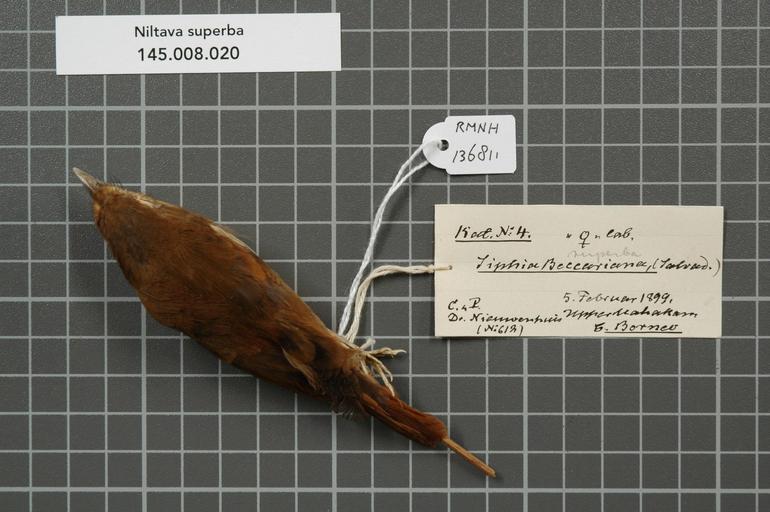 | Keywords: Naturalis Biodiversity Center - RMNH.AVES.136811 1 - Niltava superba (Stresemann, 1925) - Muscicapidae - bird skin specimen.jpeg  artwork Dimensions artwork Document type Muscicapidae Niltava Individual count 1 Infraspecific epithet Infraspecific rank Institution Naturalis Kind of unit artwork Kind of unit specimen skin Life stage Indonesia C Borneo Upper Mahakam Medium artwork Nomenclatural code Sex remark on label female lab Occurrence ID page Other fields Other versions artwork Permission license Naturalis donation CC-0 Publication location Scientific name Niltava superba Stresemann 1925 Scientific name authorship Stresemann 1925 female Source url http //bioportal naturalis nl Specific epithet superba State or province C Borneo Upper Mahakam Subject keywords artwork Subject keywords publication Title artwork Title publication Type status Uploaded with GWToolset Naturalis_Biodiversity_Center_-_RMNH AVES 136811_1_-_Niltava_superba_ Stresemann _1925 _-_Muscicapidae_-_bird_skin_specimen http //medialib naturalis nl/file/id/RMNH AVES 136811_1/format/large Media donated by Naturalis Biodiversity Center Songbird specimens at Naturalis Biodiversity Center Cyornis superbus museum specimens  |