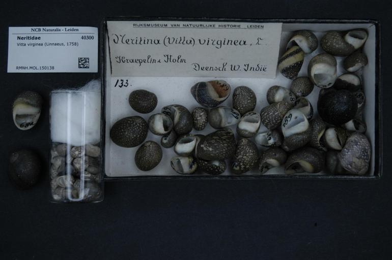 | Keywords: Naturalis Biodiversity Center - RMNH.MOL.150138 - Vitta virginea (Linnaeus, 1758) - Neritidae - Mollusc shell.jpeg artwork Dimensions artwork Document type Neritidae Vitta Individual count Infraspecific epithet Infraspecific rank Institution Naturalis Kind of unit artwork Kind of unit specimen shell Life stage Medium artwork Nomenclatural code Scale the width of the text on the species/QR-code label is 38 mm Occurrence ID page Other fields Other versions artwork Permission license Naturalis donation CC-0 Mollusca Publication location Scientific name Vitta virginea Linnaeus 1758 Scientific name authorship Linnaeus 1758 Source url http //bioportal naturalis nl Specific epithet virginea State or province Subject keywords artwork Subject keywords publication Title artwork Title publication Type status Uploaded with GWToolset Naturalis_Biodiversity_Center_-_RMNH MOL 150138_-_Vitta_virginea_ Linnaeus _1758 _-_Neritidae_-_Mollusc_shell http //medialib naturalis nl/file/id/RMNH MOL 150138/format/large Media donated by Naturalis Biodiversity Center Molluscs at Naturalis from the Rijksmuseum van Natuurlijke Historie Vitta virginea |