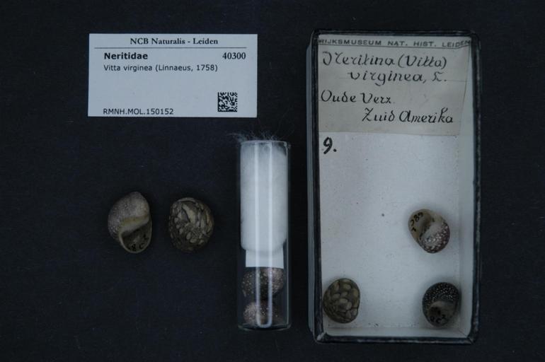 | Keywords: Naturalis Biodiversity Center - RMNH.MOL.150152 - Vitta virginea (Linnaeus, 1758) - Neritidae - Mollusc shell.jpeg artwork Dimensions artwork Document type Neritidae Vitta Individual count Infraspecific epithet Infraspecific rank Institution Naturalis Kind of unit artwork Kind of unit specimen shell Life stage Medium artwork Nomenclatural code Scale the width of the text on the species/QR-code label is 38 mm Occurrence ID page Other fields Other versions artwork Permission license Naturalis donation CC-0 Mollusca Publication location Scientific name Vitta virginea Linnaeus 1758 Scientific name authorship Linnaeus 1758 Source url http //bioportal naturalis nl Specific epithet virginea State or province Subject keywords artwork Subject keywords publication Title artwork Title publication Type status Uploaded with GWToolset Naturalis_Biodiversity_Center_-_RMNH MOL 150152_-_Vitta_virginea_ Linnaeus _1758 _-_Neritidae_-_Mollusc_shell http //medialib naturalis nl/file/id/RMNH MOL 150152/format/large Media donated by Naturalis Biodiversity Center Molluscs at Naturalis from the Rijksmuseum van Natuurlijke Historie Vitta virginea |