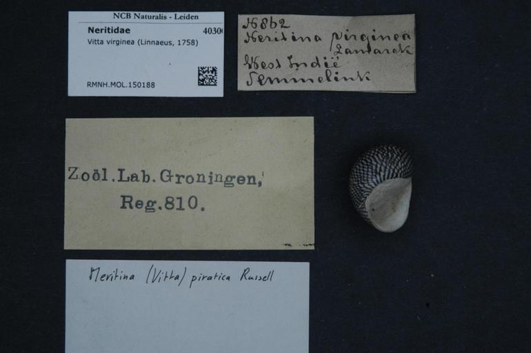 | Keywords: Naturalis Biodiversity Center - RMNH.MOL.150188 - Vitta virginea (Linnaeus, 1758) - Neritidae - Mollusc shell.jpeg artwork Dimensions artwork Document type Neritidae Vitta Individual count Infraspecific epithet Infraspecific rank Institution Naturalis Kind of unit artwork Kind of unit specimen shell Life stage Medium artwork Nomenclatural code Scale the width of the text on the species/QR-code label is 38 mm Occurrence ID page Other fields Other versions artwork Permission license Naturalis donation CC-0 Mollusca Publication location Scientific name Vitta virginea Linnaeus 1758 Scientific name authorship Linnaeus 1758 Source url http //bioportal naturalis nl Specific epithet virginea State or province Subject keywords artwork Subject keywords publication Title artwork Title publication Type status Uploaded with GWToolset Naturalis_Biodiversity_Center_-_RMNH MOL 150188_-_Vitta_virginea_ Linnaeus _1758 _-_Neritidae_-_Mollusc_shell http //medialib naturalis nl/file/id/RMNH MOL 150188/format/large Media donated by Naturalis Biodiversity Center Molluscs at Naturalis from the Rijksmuseum van Natuurlijke Historie Vitta virginea |