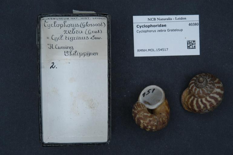 | Keywords: Naturalis Biodiversity Center - RMNH.MOL.154517 - Cyclostoma tigrinum Sowerby, 1842 - Pomatiidae - Mollusc shell.jpeg artwork Dimensions artwork Document type Pomatiidae Cyclostoma Individual count Infraspecific epithet Infraspecific rank Institution Naturalis Kind of unit artwork Kind of unit specimen shell Life stage Philippines Medium artwork Nomenclatural code Source institute Leiden Scale the width of the text on the species/QR-code label is 38 mm Occurrence ID page Other fields Other versions artwork Permission license Naturalis donation CC-0 Mollusca Publication location Scientific name Cyclostoma tigrinum Sowerby 1842 Scientific name authorship Sowerby 1842 Source url http //bioportal naturalis nl Specific epithet tigrinum State or province Subject keywords artwork Subject keywords publication Title artwork Title publication Type status possible syntypes Uploaded with GWToolset Naturalis_Biodiversity_Center_-_RMNH MOL 154517_-_Cyclostoma_tigrinum_Sowerby _1842_-_Pomatiidae_-_Mollusc_shell http //medialib naturalis nl/file/id/RMNH MOL 154517/format/large Media donated by Naturalis Biodiversity Center Molluscs at Naturalis from the Rijksmuseum van Natuurlijke Historie Cyclostoma tigrinum Cyclostoma |