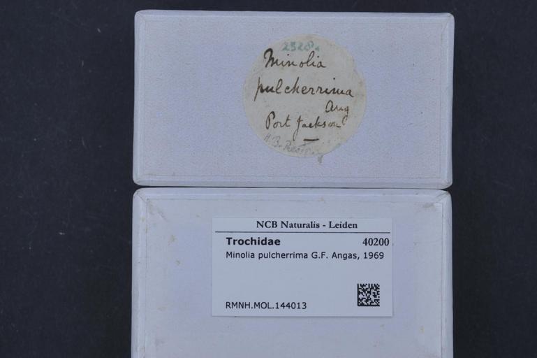 | Keywords: Naturalis Biodiversity Center - RMNH.MOL.144013 1 - Minolia pulcherrima G.F. Angas, 1969 - Solariellidae - Mollusc shell.jpeg  artwork Dimensions artwork Document type Solariellidae Minolia Individual count Infraspecific epithet Infraspecific rank Institution Naturalis Kind of unit artwork Kind of unit specimen shell Life stage Medium artwork Nomenclatural code Source institute Leiden Scale the width of the text on the species/QR-code label is 38 mm Occurrence ID page Other fields Other versions artwork Permission license Naturalis donation CC-0 Mollusca Publication location Scientific name Minolia pulcherrima G F Angas 1969 Scientific name authorship G F Angas 1969 Source url http //bioportal naturalis nl Specific epithet pulcherrima State or province Subject keywords artwork Subject keywords publication Title artwork Title publication Type status Uploaded with GWToolset Naturalis_Biodiversity_Center_-_RMNH MOL 144013_1_-_Minolia_pulcherrima_G F _Angas _1969_-_Solariellidae_-_Mollusc_shell http //medialib naturalis nl/file/id/RMNH MOL 144013_1/format/large Molluscs at Naturalis from the Rijksmuseum van Natuurlijke Historie Media donated by Naturalis Biodiversity Center Minolia Minolia pulcherrima |
