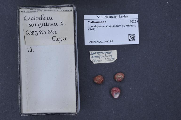 Keywords: Naturalis Biodiversity Center - RMNH.MOL.144278 - Homalopoma sanguineum (Linnaeus, 1758) - Colloniidae - Mollusc shell.jpeg artwork Dimensions artwork Document type Colloniidae Homalopoma Individual count Infraspecific epithet Infraspecific rank Institution Naturalis Kind of unit artwork Kind of unit specimen shell Life stage Medium artwork Nomenclatural code Source institute Leiden Scale the width of the text on the species/QR-code label is 38 mm Occurrence ID page Other fields Other versions artwork Permission license Naturalis donation CC-0 Mollusca Publication location Scientific name Homalopoma sanguineum Linnaeus 1758 Scientific name authorship Linnaeus 1758 Source url http //bioportal naturalis nl Specific epithet sanguineum State or province Subject keywords artwork Subject keywords publication Title artwork Title publication Type status Uploaded with GWToolset Naturalis_Biodiversity_Center_-_RMNH MOL 144278_-_Homalopoma_sanguineum_ Linnaeus _1758 _-_Colloniidae_-_Mollusc_shell http //medialib naturalis nl/file/id/RMNH MOL 144278/format/large Molluscs at Naturalis from the Rijksmuseum van Natuurlijke Historie Media donated by Naturalis Biodiversity Center Homalopoma sanguineum |