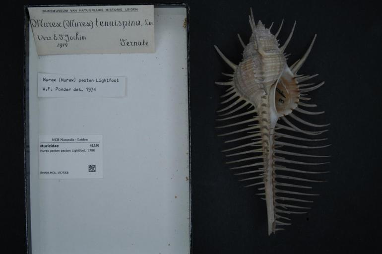 | Keywords: Naturalis Biodiversity Center - RMNH.MOL.197568 - Murex pecten pecten Lightfoot, 1786 - Muricidae - Mollusc shell.jpeg artwork Dimensions artwork Document type Muricidae subfamily Muricinae Murex Individual count Infraspecific epithet pecten Infraspecific rank Institution Naturalis Kind of unit artwork Kind of unit specimen shell Life stage Medium artwork Nomenclatural code Source institute Rijksmuseum van Natuurlijke Historie Leiden Scale the width of the text on the species/QR-code label is 38 mm Occurrence ID page Neogastropoda Other fields Other versions artwork Permission license Naturalis donation CC-0 Mollusca Publication location Scientific name Murex pecten pecten Lightfoot 1786 Scientific name authorship Lightfoot 1786 Source url http //bioportal naturalis nl Specific epithet pecten State or province Subject keywords artwork Subject keywords publication Title artwork Title publication Type status Uploaded with GWToolset Naturalis_Biodiversity_Center_-_RMNH MOL 197568_-_Murex_pecten_pecten_Lightfoot _1786_-_Muricidae_-_Mollusc_shell http //medialib naturalis nl/file/id/RMNH MOL 197568/format/large Media donated by Naturalis Biodiversity Center Molluscs at Naturalis from the Rijksmuseum van Natuurlijke Historie Murex pecten |