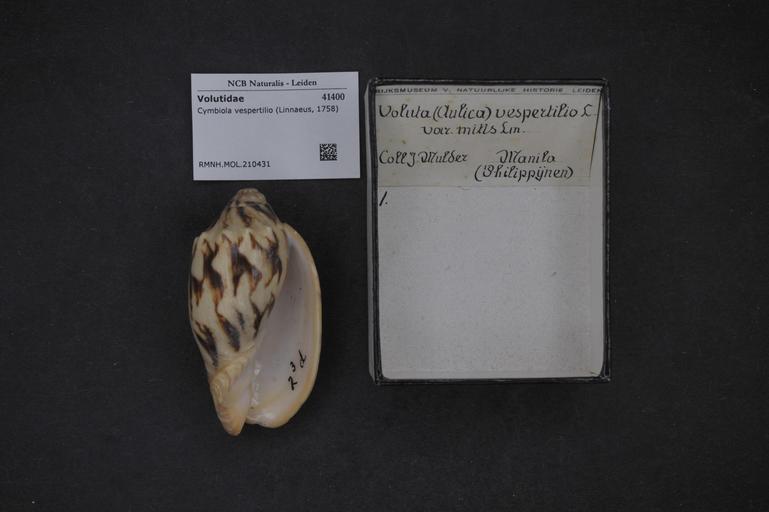 Keywords: Naturalis Biodiversity Center - RMNH.MOL.210431 - Cymbiola vespertilio Linnaeus, 1758 - Volutidae - Mollusc shell.jpeg artwork Dimensions artwork Document type Volutidae Cymbiola Individual count Infraspecific epithet Infraspecific rank Institution Naturalis Kind of unit artwork Kind of unit specimen shell Life stage Medium artwork Nomenclatural code Source institute Rijksmuseum van Natuurlijke Historie Leiden Scale the width of the text on the species/QR-code label is 38 mm Occurrence ID page Neogastropoda Other fields Other versions artwork Permission license Naturalis donation CC-0 Mollusca Publication location Scientific name Cymbiola vespertilio Linnaeus 1758 Scientific name authorship Linnaeus 1758 Source url http //bioportal naturalis nl Specific epithet vespertilio State or province Subject keywords artwork Subject keywords publication Title artwork Title publication Type status Uploaded with GWToolset Naturalis_Biodiversity_Center_-_RMNH MOL 210431_-_Cymbiola_vespertilio_Linnaeus _1758_-_Volutidae_-_Mollusc_shell http //medialib naturalis nl/file/id/RMNH MOL 210431/format/large Media donated by Naturalis Biodiversity Center Molluscs at Naturalis from the Rijksmuseum van Natuurlijke Historie Cymbiola vespertilio Cymbiola |