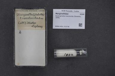 | Keywords: Naturalis Biodiversity Center - RMNH.MOL.215738 - Austroginella translucida (Sowerby, 1846) - Marginellidae - Mollusc shell.jpeg artwork Dimensions artwork Document type Marginellidae Austroginella Individual count Infraspecific epithet Infraspecific rank Institution Naturalis Kind of unit artwork Kind of unit specimen shell Life stage Medium artwork Nomenclatural code Source institute Rijksmuseum van Natuurlijke Historie Leiden Scale the width of the text on the species/QR-code label is 38 mm Occurrence ID page Neogastropoda Other fields Other versions artwork Permission license Naturalis donation CC-0 Mollusca Publication location Scientific name Austroginella translucida Sowerby 1846 Scientific name authorship Sowerby 1846 Source url http //bioportal naturalis nl Specific epithet translucida State or province Subject keywords artwork Subject keywords publication Title artwork Title publication Type status Uploaded with GWToolset Naturalis_Biodiversity_Center_-_RMNH MOL 215738_-_Austroginella_translucida_ Sowerby _1846 _-_Marginellidae_-_Mollusc_shell http //medialib naturalis nl/file/id/RMNH MOL 215738/format/large Media donated by Naturalis Biodiversity Center Molluscs at Naturalis from the Rijksmuseum van Natuurlijke Historie Austroginella translucida Austroginella |