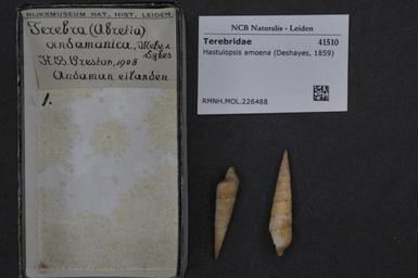 Keywords: Naturalis Biodiversity Center - RMNH.MOL.226488 - Hastulopsis amoena (Deshayes, 1859) - Terebridae - Mollusc shell.jpeg artwork Dimensions artwork Document type Terebridae Hastulopsis Individual count Infraspecific epithet Infraspecific rank Institution Naturalis Kind of unit artwork Kind of unit specimen shell Life stage Medium artwork Nomenclatural code Source institute Rijksmuseum van Natuurlijke Historie Leiden Scale the width of the text on the species/QR-code label is 38 mm Occurrence ID page Other fields Other versions artwork Permission license Naturalis donation CC-0 Mollusca Publication location Scientific name Hastulopsis amoena Deshayes 1859 Scientific name authorship Deshayes 1859 Source url http //bioportal naturalis nl Specific epithet amoena State or province Subject keywords artwork Subject keywords publication Title artwork Title publication Type status Uploaded with GWToolset Naturalis_Biodiversity_Center_-_RMNH MOL 226488_-_Hastulopsis_amoena_ Deshayes _1859 _-_Terebridae_-_Mollusc_shell http //medialib naturalis nl/file/id/RMNH MOL 226488/format/large Molluscs at Naturalis from the Rijksmuseum van Natuurlijke Historie Media donated by Naturalis Biodiversity Center Hastulopsis amoena Hastulopsis |