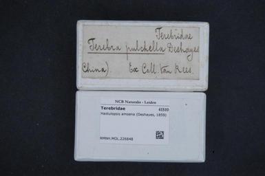 Keywords: Naturalis Biodiversity Center - RMNH.MOL.226848 1 - Hastulopsis amoena (Deshayes, 1859) - Terebridae - Mollusc shell.jpeg artwork Dimensions artwork Document type Terebridae Hastulopsis Individual count Infraspecific epithet Infraspecific rank Institution Naturalis Kind of unit artwork Kind of unit specimen shell Life stage Medium artwork Nomenclatural code Source institute Rijksmuseum van Natuurlijke Historie Leiden Scale the width of the text on the species/QR-code label is 38 mm Occurrence ID page Other fields Other versions artwork Permission license Naturalis donation CC-0 Mollusca Publication location Scientific name Hastulopsis amoena Deshayes 1859 Scientific name authorship Deshayes 1859 Source url http //bioportal naturalis nl Specific epithet amoena State or province Subject keywords artwork Subject keywords publication Title artwork Title publication Type status Uploaded with GWToolset Naturalis_Biodiversity_Center_-_RMNH MOL 226848_1_-_Hastulopsis_amoena_ Deshayes _1859 _-_Terebridae_-_Mollusc_shell http //medialib naturalis nl/file/id/RMNH MOL 226848_1/format/large Molluscs at Naturalis from the Rijksmuseum van Natuurlijke Historie Media donated by Naturalis Biodiversity Center Hastulopsis amoena Hastulopsis |