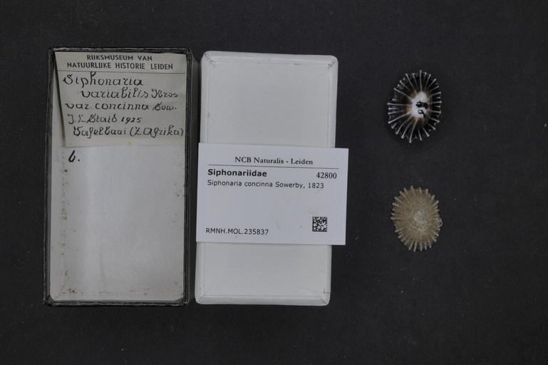 Keywords: Naturalis Biodiversity Center - RMNH.MOL.235837 - Siphonaria concinna Sowerby, 1823 - Siphonariidae - Mollusc shell.jpeg artwork Dimensions artwork Document type Siphonariidae Siphonaria Individual count Infraspecific epithet Infraspecific rank Institution Naturalis Kind of unit artwork Kind of unit specimen shell Life stage Medium artwork Nomenclatural code Source institute Rijksmuseum van Natuurlijke Historie Leiden Scale the width of the text on the species/QR-code label is 38 mm Occurrence ID page Other fields Other versions artwork Permission license Naturalis donation CC-0 Mollusca Publication location Scientific name Siphonaria concinna Sowerby 1823 Scientific name authorship Sowerby 1823 Source url http //bioportal naturalis nl Specific epithet concinna State or province Subject keywords artwork Subject keywords publication Title artwork Title publication Type status Uploaded with GWToolset Naturalis_Biodiversity_Center_-_RMNH MOL 235837_-_Siphonaria_concinna_Sowerby _1823_-_Siphonariidae_-_Mollusc_shell http //medialib naturalis nl/file/id/RMNH MOL 235837/format/large Molluscs at Naturalis from the Rijksmuseum van Natuurlijke Historie Media donated by Naturalis Biodiversity Center Siphonaria concinna Siphonaria |