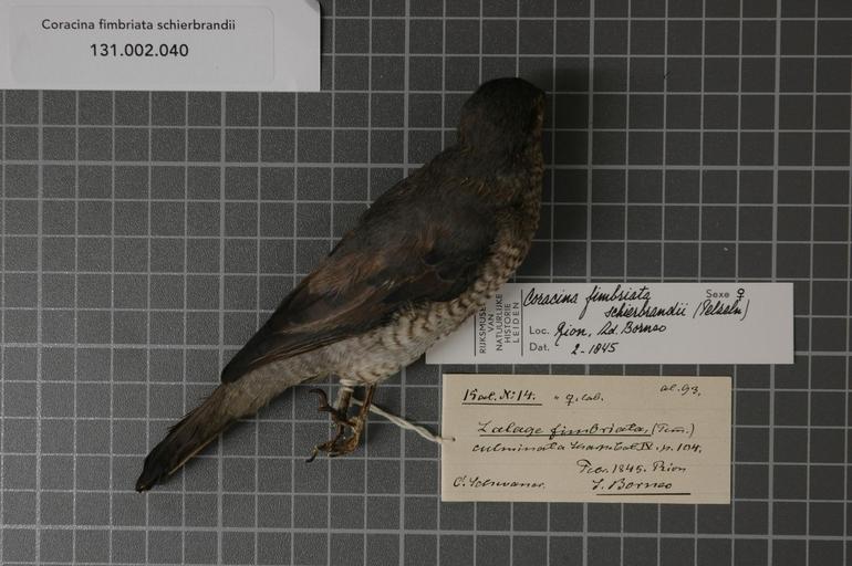 | Keywords: Naturalis Biodiversity Center - RMNH.AVES.123800 1 - Coracina fimbriata schierbrandii (Pelzeln, 1865) - Campephagidae - bird skin specimen.jpeg artwork Dimensions artwork Document type Campephagidae Coracina Individual count 1 Infraspecific epithet schierbrandii Infraspecific rank Institution Naturalis Kind of unit artwork Kind of unit specimen skin Life stage Indonesia Zd Borneo Rion Medium artwork Nomenclatural code Sex remark female lab Occurrence ID page Other fields Other versions artwork Permission license Naturalis donation CC-0 Publication location Scientific name Coracina fimbriata schierbrandii Pelzeln 1865 Scientific name authorship Pelzeln 1865 female Source url http //bioportal naturalis nl Specific epithet fimbriata State or province Zd Borneo Subject keywords artwork Subject keywords publication Title artwork Title publication Type status Uploaded with GWToolset Naturalis_Biodiversity_Center_-_RMNH AVES 123800_1_-_Coracina_fimbriata_schierbrandii_ Pelzeln _1865 _-_Campephagidae_-_bird_skin_specimen http //medialib naturalis nl/file/id/RMNH AVES 123800_1/format/large Media donated by Naturalis Biodiversity Center Songbird specimens at Naturalis Biodiversity Center Coracina fimbriata schierbrandii |