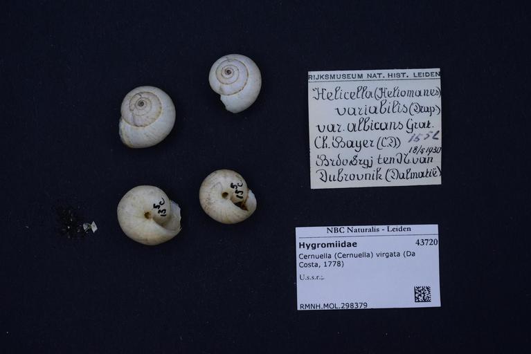 | Keywords: Naturalis Biodiversity Center - RMNH.MOL.298379 - Cernuella (Cernuella) virgata (Da Costa, 1778) - Hygromiidae - Mollusc shell.jpeg  artwork Dimensions artwork Document type Hygromiidae subfamily Hygromiinae Cernuella Individual count Infraspecific epithet Infraspecific rank Institution Naturalis Kind of unit artwork Kind of unit specimen shell Life stage U s s r Medium artwork Nomenclatural code Source institute Rijksmuseum van Natuurlijke Historie Leiden Scale the width of the text on the species/QR-code label is 38 mm Occurrence ID page Other fields Other versions artwork Permission license Naturalis donation CC-0 Mollusca Publication location Scientific name Cernuella Cernuella virgata Da Costa 1778 Scientific name authorship Da Costa 1778 Source url http //bioportal naturalis nl Specific epithet virgata State or province Subject keywords artwork Subject keywords publication Title artwork Title publication Type status Uploaded with GWToolset Naturalis_Biodiversity_Center_-_RMNH MOL 298379_-_Cernuella_ Cernuella _virgata_ Da_Costa _1778 _-_Hygromiidae_-_Mollusc_shell http //medialib naturalis nl/file/id/RMNH MOL 298379/format/large Media donated by Naturalis Biodiversity Center Molluscs at Naturalis from the Rijksmuseum van Natuurlijke Historie Cernuella virgata Cernuella |
