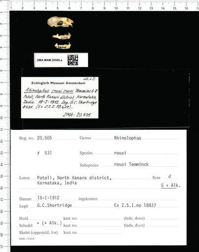 | Keywords: Naturalis Biodiversity Center - ZMA.MAM.20505.a lat - Rhinolophus rouxii rouxii - skull.jpeg artwork Dimensions artwork Document type Rhinolophus Individual count 1 Infraspecific epithet rouxii Infraspecific rank Institution Naturalis Kind of unit artwork Kind of unit specimen skull Life stage Potoli North Kanari district Karnataka India Medium artwork Nomenclatural code Occurrence ID page Other fields Other versions artwork Permission license Naturalis donation CC-0 Publication location Scientific name Rhinolophus rouxii rouxii Scientific name authorship male Source url http //bioportal naturalis nl Specific epithet rouxii State or province Subject keywords artwork Subject keywords publication Title artwork Title publication Type status Uploaded with GWToolset Naturalis_Biodiversity_Center_-_ZMA MAM 20505 a_lat_-_Rhinolophus_rouxii_rouxii_-_skull http //medialib naturalis nl/file/id/ZMA MAM 20505 a_lat/format/large Mammals at Naturalis from the Zoölogisch Museum Amsterdam Media donated by Naturalis Biodiversity Center Rhinolophus rouxii Rhinolophus |