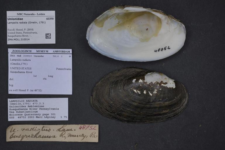 Keywords: Naturalis Biodiversity Center - ZMA.MOLL.210014 - Lampsilis radiata (Gmelin, 1791) - Unionidae - Mollusc shell.jpeg artwork Dimensions artwork Document type Unionidae subfamily Ambleminae Lampsilis Individual count Infraspecific epithet Infraspecific rank Institution Naturalis Kind of unit artwork Kind of unit specimen shell Life stage United States Pennsylvania Susquehanna River Medium artwork Nomenclatural code Scale the width of the text on the species/QR-code label is 38 mm Occurrence ID page Other fields Other versions artwork Permission license Naturalis donation CC-0 Mollusca Publication location Scientific name Lampsilis radiata Gmelin 1791 Scientific name authorship Gmelin 1791 Source url http //bioportal naturalis nl Specific epithet radiata State or province Pennsylvania Subject keywords artwork Subject keywords publication Title artwork Title publication Type status Uploaded with GWToolset Naturalis_Biodiversity_Center_-_ZMA MOLL 210014_-_Lampsilis_radiata_ Gmelin _1791 _-_Unionidae_-_Mollusc_shell http //medialib naturalis nl/file/id/ZMA MOLL 210014/format/large Media donated by Naturalis Biodiversity Center Molluscs at Naturalis from the Zoölogisch Museum Amsterdam Lampsilis radiata Lampsilis |