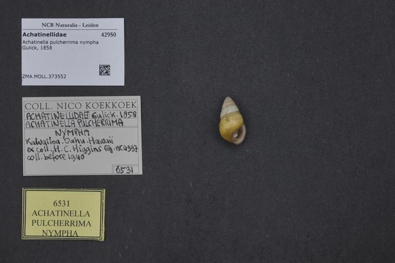 | Keywords: Naturalis Biodiversity Center - ZMA.MOLL.373552 - Achatinella pulcherrima nympha Gulick, 1858 - Achatinellidae - Mollusc shell.jpeg  artwork Dimensions artwork Document type Achatinellidae subfamily Achatinellinae Achatinella Individual count Infraspecific epithet nympha Infraspecific rank Institution Naturalis Kind of unit artwork Kind of unit specimen shell Life stage Medium artwork Nomenclatural code Collection remarks verbatim collectienaamSource institute Rijksmuseum van Natuurlijke Historie Leiden Scale the width of the text on the species/QR-code label is 38 mm Occurrence ID page Other fields Other versions artwork Permission license Naturalis donation CC-0 Mollusca Publication location Scientific name Achatinella pulcherrima nympha Gulick 1858 Scientific name authorship Gulick 1858 Source url http //bioportal naturalis nl Specific epithet pulcherrima State or province Subject keywords artwork Subject keywords publication Title artwork Title publication Type status Uploaded with GWToolset Naturalis_Biodiversity_Center_-_ZMA MOLL 373552_-_Achatinella_pulcherrima_nympha_Gulick _1858_-_Achatinellidae_-_Mollusc_shell http //medialib naturalis nl/file/id/ZMA MOLL 373552/format/large Molluscs at Naturalis from the Zoölogisch Museum Amsterdam Media donated by Naturalis Biodiversity Center Achatinella pulcherrima Achatinella |