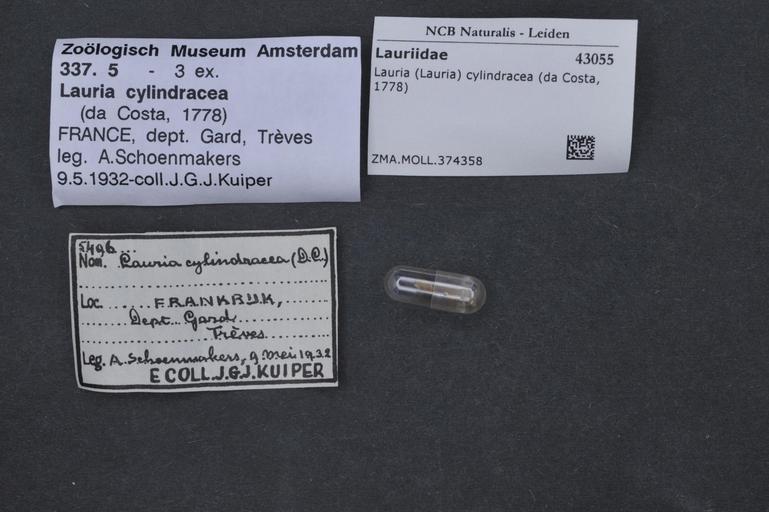 | Keywords: Naturalis Biodiversity Center - ZMA.MOLL.374358 - Lauria (Lauria) cylindracea (Da Costa, 1778) - Lauriidae - Mollusc shell.jpeg  artwork Dimensions artwork Document type Lauriidae Lauria Individual count Infraspecific epithet Infraspecific rank Institution Naturalis Kind of unit artwork Kind of unit specimen shell Life stage Medium artwork Nomenclatural code Source institute Rijksmuseum van Natuurlijke Historie Leiden Scale the width of the text on the species/QR-code label is 38 mm Occurrence ID page Other fields Other versions artwork Permission license Naturalis donation CC-0 Mollusca Publication location Scientific name Lauria Lauria cylindracea Da Costa 1778 Scientific name authorship Da Costa 1778 Source url http //bioportal naturalis nl Specific epithet cylindracea State or province Subject keywords artwork Subject keywords publication Title artwork Title publication Type status Uploaded with GWToolset Naturalis_Biodiversity_Center_-_ZMA MOLL 374358_-_Lauria_ Lauria _cylindracea_ Da_Costa _1778 _-_Lauriidae_-_Mollusc_shell http //medialib naturalis nl/file/id/ZMA MOLL 374358/format/large Molluscs at Naturalis from the Zoölogisch Museum Amsterdam Media donated by Naturalis Biodiversity Center Lauria cylindracea Lauria |