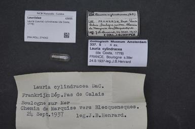 | Keywords: Naturalis Biodiversity Center - ZMA.MOLL.374362 - Lauria (Lauria) cylindracea (Da Costa, 1778) - Lauriidae - Mollusc shell.jpeg  artwork Dimensions artwork Document type Lauriidae Lauria Individual count Infraspecific epithet Infraspecific rank Institution Naturalis Kind of unit artwork Kind of unit specimen shell Life stage Medium artwork Nomenclatural code Source institute Rijksmuseum van Natuurlijke Historie Leiden Scale the width of the text on the species/QR-code label is 38 mm Occurrence ID page Other fields Other versions artwork Permission license Naturalis donation CC-0 Mollusca Publication location Scientific name Lauria Lauria cylindracea Da Costa 1778 Scientific name authorship Da Costa 1778 Source url http //bioportal naturalis nl Specific epithet cylindracea State or province Subject keywords artwork Subject keywords publication Title artwork Title publication Type status Uploaded with GWToolset Naturalis_Biodiversity_Center_-_ZMA MOLL 374362_-_Lauria_ Lauria _cylindracea_ Da_Costa _1778 _-_Lauriidae_-_Mollusc_shell http //medialib naturalis nl/file/id/ZMA MOLL 374362/format/large Molluscs at Naturalis from the Zoölogisch Museum Amsterdam Media donated by Naturalis Biodiversity Center Lauria cylindracea Lauria |