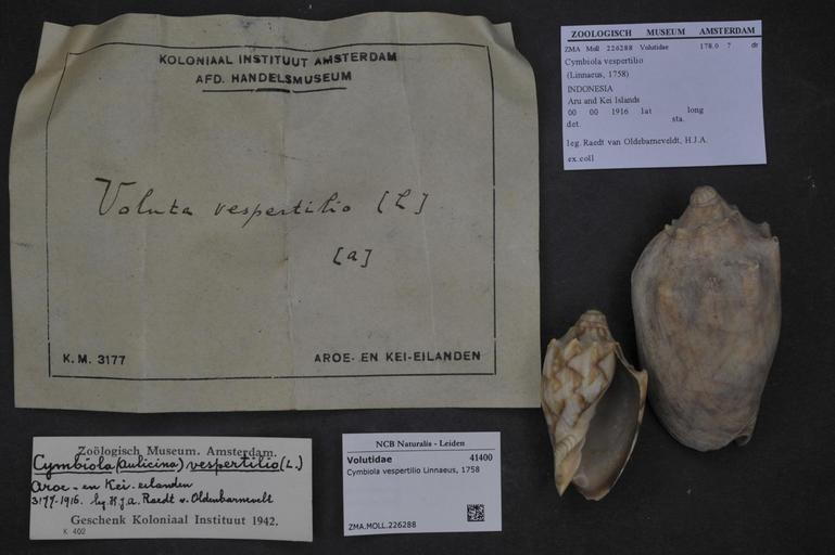 Keywords: Naturalis Biodiversity Center - ZMA.MOLL.226288 - Cymbiola vespertilio Linnaeus, 1758 - Volutidae - Mollusc shell.jpeg artwork Dimensions artwork Document type Volutidae Cymbiola Individual count Infraspecific epithet Infraspecific rank Institution Naturalis Kind of unit artwork Kind of unit specimen shell Life stage Medium artwork Nomenclatural code Scale the width of the text on the species/QR-code label is 38 mm Occurrence ID page Neogastropoda Other fields Other versions artwork Permission license Naturalis donation CC-0 Mollusca Publication location Scientific name Cymbiola vespertilio Linnaeus 1758 Scientific name authorship Linnaeus 1758 Source url http //bioportal naturalis nl Specific epithet vespertilio State or province Subject keywords artwork Subject keywords publication Title artwork Title publication Type status Uploaded with GWToolset Naturalis_Biodiversity_Center_-_ZMA MOLL 226288_-_Cymbiola_vespertilio_Linnaeus _1758_-_Volutidae_-_Mollusc_shell http //medialib naturalis nl/file/id/ZMA MOLL 226288/format/large Media donated by Naturalis Biodiversity Center Molluscs at Naturalis from the Zoölogisch Museum Amsterdam Cymbiola vespertilio Cymbiola |