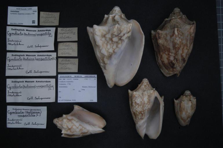 Keywords: Naturalis Biodiversity Center - ZMA.MOLL.226399 - Cymbiola vespertilio Linnaeus, 1758 - Volutidae - Mollusc shell.jpeg artwork Dimensions artwork Document type Volutidae Cymbiola Individual count Infraspecific epithet Infraspecific rank Institution Naturalis Kind of unit artwork Kind of unit specimen shell Life stage Medium artwork Nomenclatural code Scale the width of the text on the species/QR-code label is 38 mm Occurrence ID page Neogastropoda Other fields Other versions artwork Permission license Naturalis donation CC-0 Mollusca Publication location Scientific name Cymbiola vespertilio Linnaeus 1758 Scientific name authorship Linnaeus 1758 Source url http //bioportal naturalis nl Specific epithet vespertilio State or province Subject keywords artwork Subject keywords publication Title artwork Title publication Type status Uploaded with GWToolset Naturalis_Biodiversity_Center_-_ZMA MOLL 226399_-_Cymbiola_vespertilio_Linnaeus _1758_-_Volutidae_-_Mollusc_shell http //medialib naturalis nl/file/id/ZMA MOLL 226399/format/large Media donated by Naturalis Biodiversity Center Molluscs at Naturalis from the Zoölogisch Museum Amsterdam Cymbiola vespertilio Cymbiola |