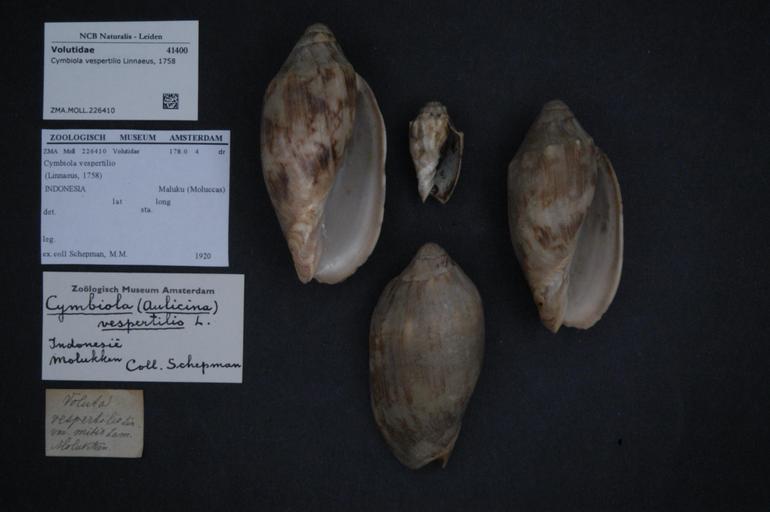 Keywords: Naturalis Biodiversity Center - ZMA.MOLL.226410 - Cymbiola vespertilio Linnaeus, 1758 - Volutidae - Mollusc shell.jpeg artwork Dimensions artwork Document type Volutidae Cymbiola Individual count Infraspecific epithet Infraspecific rank Institution Naturalis Kind of unit artwork Kind of unit specimen shell Life stage Medium artwork Nomenclatural code Scale the width of the text on the species/QR-code label is 38 mm Occurrence ID page Neogastropoda Other fields Other versions artwork Permission license Naturalis donation CC-0 Mollusca Publication location Scientific name Cymbiola vespertilio Linnaeus 1758 Scientific name authorship Linnaeus 1758 Source url http //bioportal naturalis nl Specific epithet vespertilio State or province Subject keywords artwork Subject keywords publication Title artwork Title publication Type status Uploaded with GWToolset Naturalis_Biodiversity_Center_-_ZMA MOLL 226410_-_Cymbiola_vespertilio_Linnaeus _1758_-_Volutidae_-_Mollusc_shell http //medialib naturalis nl/file/id/ZMA MOLL 226410/format/large Media donated by Naturalis Biodiversity Center Molluscs at Naturalis from the Zoölogisch Museum Amsterdam Cymbiola vespertilio Cymbiola |