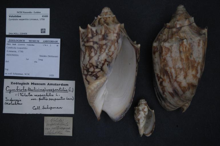 Keywords: Naturalis Biodiversity Center - ZMA.MOLL.226406 - Cymbiola vespertilio Linnaeus, 1758 - Volutidae - Mollusc shell.jpeg artwork Dimensions artwork Document type Volutidae Cymbiola Individual count Infraspecific epithet Infraspecific rank Institution Naturalis Kind of unit artwork Kind of unit specimen shell Life stage Medium artwork Nomenclatural code Scale the width of the text on the species/QR-code label is 38 mm Occurrence ID page Neogastropoda Other fields Other versions artwork Permission license Naturalis donation CC-0 Mollusca Publication location Scientific name Cymbiola vespertilio Linnaeus 1758 Scientific name authorship Linnaeus 1758 Source url http //bioportal naturalis nl Specific epithet vespertilio State or province Subject keywords artwork Subject keywords publication Title artwork Title publication Type status Uploaded with GWToolset Naturalis_Biodiversity_Center_-_ZMA MOLL 226406_-_Cymbiola_vespertilio_Linnaeus _1758_-_Volutidae_-_Mollusc_shell http //medialib naturalis nl/file/id/ZMA MOLL 226406/format/large Media donated by Naturalis Biodiversity Center Molluscs at Naturalis from the Zoölogisch Museum Amsterdam Cymbiola vespertilio Cymbiola |