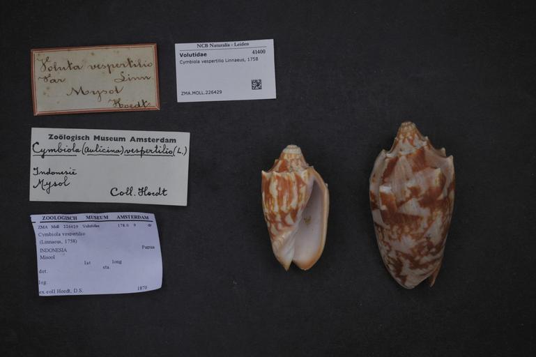 Keywords: Naturalis Biodiversity Center - ZMA.MOLL.226429 - Cymbiola vespertilio Linnaeus, 1758 - Volutidae - Mollusc shell.jpeg artwork Dimensions artwork Document type Volutidae Cymbiola Individual count Infraspecific epithet Infraspecific rank Institution Naturalis Kind of unit artwork Kind of unit specimen shell Life stage Medium artwork Nomenclatural code Scale the width of the text on the species/QR-code label is 38 mm Occurrence ID page Neogastropoda Other fields Other versions artwork Permission license Naturalis donation CC-0 Mollusca Publication location Scientific name Cymbiola vespertilio Linnaeus 1758 Scientific name authorship Linnaeus 1758 Source url http //bioportal naturalis nl Specific epithet vespertilio State or province Subject keywords artwork Subject keywords publication Title artwork Title publication Type status Uploaded with GWToolset Naturalis_Biodiversity_Center_-_ZMA MOLL 226429_-_Cymbiola_vespertilio_Linnaeus _1758_-_Volutidae_-_Mollusc_shell http //medialib naturalis nl/file/id/ZMA MOLL 226429/format/large Media donated by Naturalis Biodiversity Center Molluscs at Naturalis from the Zoölogisch Museum Amsterdam Cymbiola vespertilio Cymbiola |