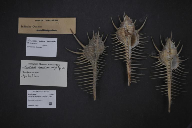 | Keywords: Naturalis Biodiversity Center - ZMA.MOLL.26743 - Murex pecten pecten Lightfoot, 1786 - Muricidae - Mollusc shell.jpeg artwork Dimensions artwork Document type Muricidae subfamily Muricinae Murex Individual count Infraspecific epithet pecten Infraspecific rank Institution Naturalis Kind of unit artwork Kind of unit specimen shell Life stage Indonesia; Moluccas Medium artwork Nomenclatural code Scale the width of the text on the species/QR-code label is 38 mm Occurrence ID page Neogastropoda Other fields Other versions artwork Permission license Naturalis donation CC-0 Mollusca Publication location Scientific name Murex pecten pecten Lightfoot 1786 Scientific name authorship Lightfoot 1786 Source url http //bioportal naturalis nl Specific epithet pecten State or province Moluccas Subject keywords artwork Subject keywords publication Title artwork Title publication Type status Uploaded with GWToolset Naturalis_Biodiversity_Center_-_ZMA MOLL 26743_-_Murex_pecten_pecten_Lightfoot _1786_-_Muricidae_-_Mollusc_shell http //medialib naturalis nl/file/id/ZMA MOLL 26743/format/large Media donated by Naturalis Biodiversity Center Molluscs at Naturalis from the Zoölogisch Museum Amsterdam Murex pecten |