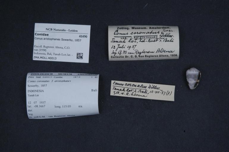 | Keywords: Naturalis Biodiversity Center - ZMA.MOLL.40013 - Conus aristophanes Sowerby, 1857 - Conidae - Mollusc shell.jpeg artwork Dimensions artwork Document type Conidae Conus Individual count Infraspecific epithet Infraspecific rank Institution Naturalis Kind of unit artwork Kind of unit specimen shell Life stage Indonesia Bali Tanah Lot; lat -8 3667 lon 115 05; 12-vii-1937 Medium artwork Nomenclatural code Source institute Rijksmuseum van Natuurlijke Historie Leiden Scale the width of the text on the species/QR-code label is 38 mm Occurrence ID page Other fields Other versions artwork Permission license Naturalis donation CC-0 Mollusca Publication location Scientific name Conus aristophanes Sowerby 1857 Scientific name authorship Sowerby 1857 Source url http //bioportal naturalis nl Specific epithet aristophanes State or province Bali Subject keywords artwork Subject keywords publication Title artwork Title publication Type status Uploaded with GWToolset Naturalis_Biodiversity_Center_-_ZMA MOLL 40013_-_Conus_aristophanes_Sowerby _1857_-_Conidae_-_Mollusc_shell http //medialib naturalis nl/file/id/ZMA MOLL 40013/format/large Molluscs at Naturalis from the Zoölogisch Museum Amsterdam Media donated by Naturalis Biodiversity Center Conus aristophanes Conus |