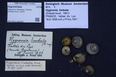 | Keywords: Naturalis Biodiversity Center - ZMA.MOLL.401544 - Hygromia (Riedelia) limbata (Draparnaud, 1805) - Hygromiidae - Mollusc shell.jpeg  artwork Dimensions artwork Document type Hygromiidae subfamily Hygromiinae Hygromia Individual count Infraspecific epithet Infraspecific rank Institution Naturalis Kind of unit artwork Kind of unit specimen shell Life stage Medium artwork Nomenclatural code Source institute Rijksmuseum van Natuurlijke Historie Leiden Scale the width of the text on the species/QR-code label is 38 mm Occurrence ID page Other fields Other versions artwork Permission license Naturalis donation CC-0 Mollusca Publication location Scientific name Hygromia Riedelia limbata Draparnaud 1805 Scientific name authorship Draparnaud 1805 Source url http //bioportal naturalis nl Specific epithet limbata State or province Subject keywords artwork Subject keywords publication Title artwork Title publication Type status Uploaded with GWToolset Naturalis_Biodiversity_Center_-_ZMA MOLL 401544_-_Hygromia_ Riedelia _limbata_ Draparnaud _1805 _-_Hygromiidae_-_Mollusc_shell http //medialib naturalis nl/file/id/ZMA MOLL 401544/format/large Molluscs at Naturalis from the Zoölogisch Museum Amsterdam Media donated by Naturalis Biodiversity Center Hygromia limbata Hygromia |