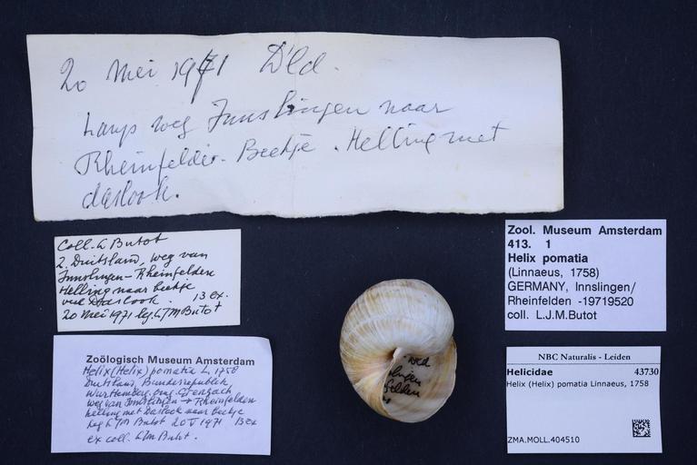| Keywords: Naturalis Biodiversity Center - ZMA.MOLL.404510 - Helix (Helix) pomatia Linnaeus, 1758 - Helicidae - Mollusc shell.jpeg artwork Dimensions artwork Document type Helicidae subfamily Helicinae Helix Individual count Infraspecific epithet Infraspecific rank Institution Naturalis Kind of unit artwork Kind of unit specimen shell Life stage Medium artwork Nomenclatural code Source institute Rijksmuseum van Natuurlijke Historie Leiden Scale the width of the text on the species/QR-code label is 38 mm Occurrence ID page Other fields Other versions artwork Permission license Naturalis donation CC-0 Mollusca Publication location Scientific name Helix Helix pomatia Linnaeus 1758 Scientific name authorship Linnaeus 1758 Source url http //bioportal naturalis nl Specific epithet pomatia State or province Subject keywords artwork Subject keywords publication Title artwork Title publication Type status Uploaded with GWToolset Naturalis_Biodiversity_Center_-_ZMA MOLL 404510_-_Helix_ Helix _pomatia_Linnaeus _1758_-_Helicidae_-_Mollusc_shell http //medialib naturalis nl/file/id/ZMA MOLL 404510/format/large Molluscs at Naturalis from the Zoölogisch Museum Amsterdam Media donated by Naturalis Biodiversity Center Helix pomatia Helix |