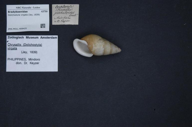 | Keywords: Naturalis Biodiversity Center - ZMA.MOLL.408425 - Dolichostyla virgata (Jay, 1839) - Bradybaenidae - Mollusc shell.jpeg  artwork Dimensions artwork Document type Bradybaenidae Dolichostyla Individual count Infraspecific epithet Infraspecific rank Institution Naturalis Kind of unit artwork Kind of unit specimen shell Life stage Medium artwork Nomenclatural code Source institute Zoölogisch Museum Amsterdam Scale the width of the text on the species/QR-code label is 38 mm Occurrence ID page Other fields Other versions artwork Permission license Naturalis donation CC-0 Mollusca Publication location Scientific name Dolichostyla virgata Jay 1839 Scientific name authorship Jay 1839 Source url http //bioportal naturalis nl Specific epithet virgata State or province Subject keywords artwork Subject keywords publication Title artwork Title publication Type status Uploaded with GWToolset Naturalis_Biodiversity_Center_-_ZMA MOLL 408425_-_Dolichostyla_virgata_ Jay _1839 _-_Bradybaenidae_-_Mollusc_shell http //medialib naturalis nl/file/id/ZMA MOLL 408425/format/large Molluscs at Naturalis from the Zoölogisch Museum Amsterdam Media donated by Naturalis Biodiversity Center Dolichostyla virgata Dolichostyla |