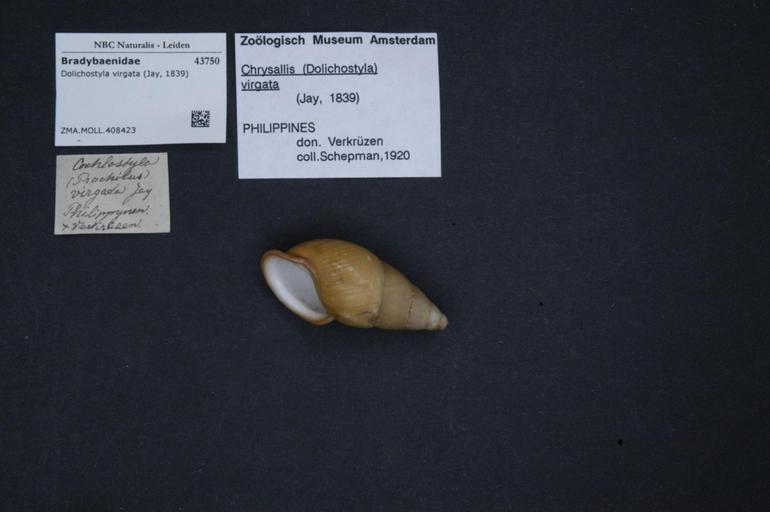 | Keywords: Naturalis Biodiversity Center - ZMA.MOLL.408423 - Dolichostyla virgata (Jay, 1839) - Bradybaenidae - Mollusc shell.jpeg  artwork Dimensions artwork Document type Bradybaenidae Dolichostyla Individual count Infraspecific epithet Infraspecific rank Institution Naturalis Kind of unit artwork Kind of unit specimen shell Life stage Medium artwork Nomenclatural code Source institute Zoölogisch Museum Amsterdam Scale the width of the text on the species/QR-code label is 38 mm Occurrence ID page Other fields Other versions artwork Permission license Naturalis donation CC-0 Mollusca Publication location Scientific name Dolichostyla virgata Jay 1839 Scientific name authorship Jay 1839 Source url http //bioportal naturalis nl Specific epithet virgata State or province Subject keywords artwork Subject keywords publication Title artwork Title publication Type status Uploaded with GWToolset Naturalis_Biodiversity_Center_-_ZMA MOLL 408423_-_Dolichostyla_virgata_ Jay _1839 _-_Bradybaenidae_-_Mollusc_shell http //medialib naturalis nl/file/id/ZMA MOLL 408423/format/large Molluscs at Naturalis from the Zoölogisch Museum Amsterdam Media donated by Naturalis Biodiversity Center Dolichostyla virgata Dolichostyla |